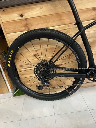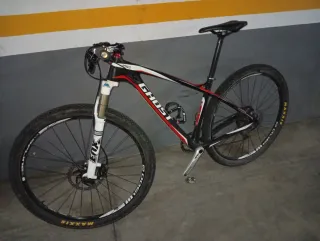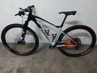 Bicicletta da montagna con telaio in carbonio, ruote da 29 pollici e sospensione con bloccaggio. - Telaio in carbonio. - Ruote da 29 pollici Tubeless. - Sospensione con bloccaggio. - Assi passanti. - Freni a disco Shimano. - Pedali XT. - Cambio SLX. - Attacco in carbonio. - Taglia M.