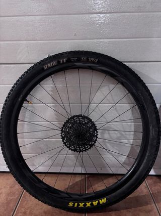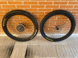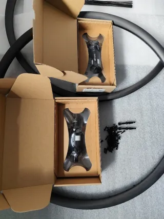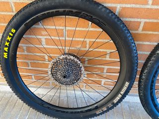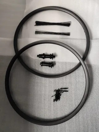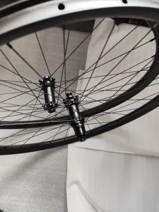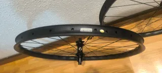 Set di ruote in fibra di carbonio boost 29 pollici. Cerchi hookless: 36mm esterno, 30mm interno, 23mm di profilo, finitura ud opaca. Mozzi DT swiss 350 Straightpull, boost, 15x110 anteriore, 12x148 posteriore, per dischi freno a 6 viti, 28 raggi, micro spline o Sram xd, a scelta. Raggi pillar psr 2015, raggiati a mano. Peso reale del set con valvole 1342g. Consegna con valvole come si vede nelle foto e un rotolo di nastro tubules da 10m. Consegna a mano 650€ (non negoziabile). Spedizione tramite wallapop.
