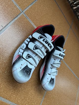 Scarpe da ciclismo LUCK modello Custom. Colore bianco, nero e rosso. Chiusura con velcro. Design Evolution. Suole in carbonio con tacchetti in gomma. Completamente nuove. Taglia 43.