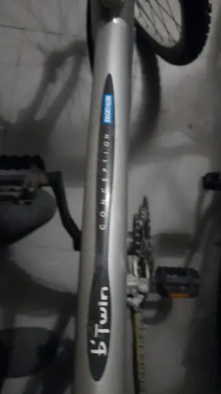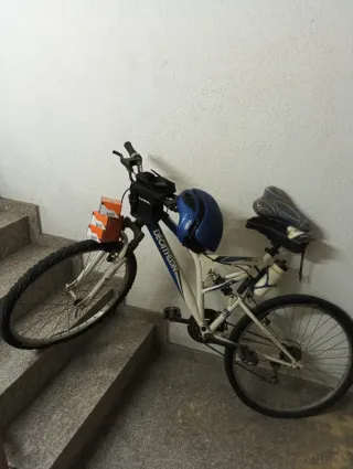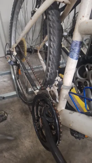 Bicicletta da montagna Decathlon. La ruota posteriore è piegata. Qualcuno l'ha maltrattata mentre era parcheggiata. Il resto è in condizioni accettabili. Ma deve essere riparata poiché, essendo senza olio, la catena è un po' arrugginita. Comunque è recuperabile ed è un'eccellente bicicletta. - Telaio in alluminio. - Sospensione anteriore. - Freni a disco.