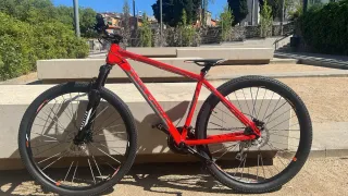 Bicicletta da montagna rossa, ideale per sentieri e strada. - Ruote da 29 pollici. - Freni idraulici. - Sospensione anteriore. - Marca wolfbike.es. - Disponibili anche due nuovi caschi Decathlon taglia grande.