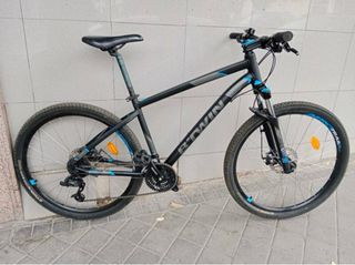 Bicicleta Rockrider di Decathlon in colore nero con dettagli blu. Telaio in alluminio. Freni a disco. Ruote tutto terreno.
