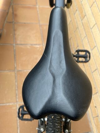 Bicicletta da montagna Decathlon. Il sellino presenta alcuni danni. Telaio della bicicletta da montagna. Borsa nera triangolare per attrezzi. Portaborraccia con bottiglia. È piena di polvere: è ferma da molto tempo. Anche bicicletta per bambini, in buono stato ma con le ruote sgonfie e polverosa per essere stata ferma. Ciò che si vede nella foto, né più né meno. Ritiro a El Bruc.