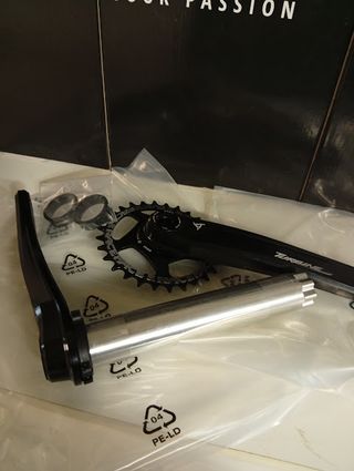 Guarnitura nuova per biciclette MTB e Fatbike con perno lungo. - Compatibile con movimento centrale BB30. - Design moderno e resistente. - Colore nero. Guarnitura nuova per mtb fatbike bb30 perno lunghezza 17cm , pedivelle lunghe 175mm raceface turbine