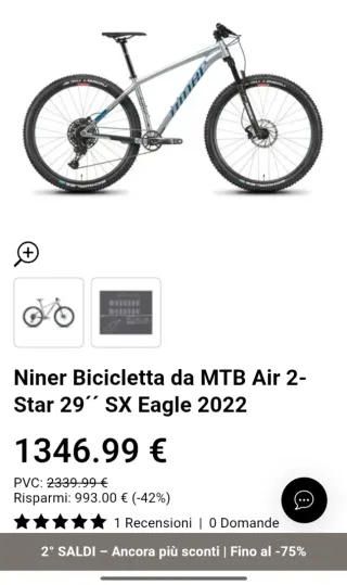 Bicicletta da MTB Niner Air Star 29 in taglia M. - Telaio in alluminio. - Ruote da 29 pollici. - Trasmissione SRAM SX Eagle 12 velocità. - Freni a disco idraulici. MTB 29 Front Nuova Niner Air Star 2 - Tg Media 54 , adatta a ciclisti 168-178 cm , in alluminio , forcella Fox 32 rhythm boost 120mm , cerchi 29 boost niner copertoni 29x 2,35 schwalbe tubeless ready , stem e manubrik 35mm raceaeffect , freni sram level , dischi 180mm avid , cambio 12 vel sram sx , cassetta lacco pignoni SRAM pg-1210 11-50 guarnitura SRAM x1 corona 32t , listino €2.399 modello 2022 in offerta al 50% sconto 1.190€