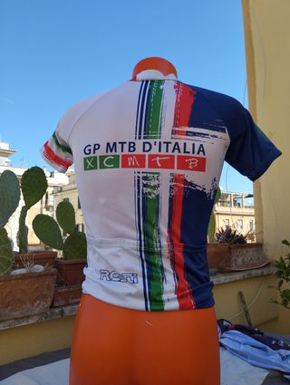 Vendo 2 maglie da ciclismo, una bianca con scritte GP MTB D'ITALIA XC MTB e inserti tricolore, e una blu. - Maglia bianca con design tricolore e logo Rosti. - Maglia blu con inserti tricolore.