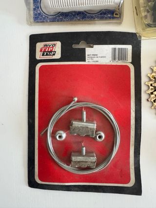 Lotto di vari componenti e accessori per biciclette. - Coppia di manopole bianche nuove - 1 coppia pattini freni Super Rapid. - Coppia di pedali con gabbiette Record - 1 coppia appendici manubrio MTB - 1 pacco pignoni 6v a vite Hero 14/28 ISO - 1 pacco pignoni 5v a vite Hero 14/28 ISO - 1 pacco pignoni 6v a vite Sunrace 14/28 ISO