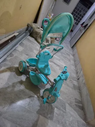 Triciclo per bambini dal design accattivante, simile a uno scooter, con cappottina parasole e luci. - Colore: azzurro. - Dotato di musica. - Ruote anteriori e posteriori. - Pedali. - Manubrio con luci.