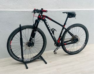 Bicicletta MTB Olympia F1 taglia M carboni (Toray 800 i Toray 1000) equipaggiata con Sram GX Eagle 12. Con pedivelle Sram Carboni con 34 denti argentati, cassetta Sram X01 10-50 (più lunga e duratura di una GX) freni Shimano SLX con pastiglie Galfer, forcella da viaggio Fox Rhythm da 100 mm con bloccaggio remoto del manubrio, cerchi in alluminio Noxon Nitro da 29" che pesano meno di 1.500 g, Maxxis Ikon 29x2'25, manubrio Prototype, sedile Ritchey Un post con Seient Selle Italia. Peso con pedali 10'5 kg. Possibilità di cambio con bici gravel, ma negoziabile.
