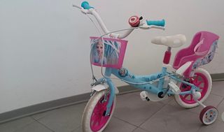 Bicicletta da bambina da 12 pollici con portabambole – cestino e stabilizzatori laterali di Disney Frozen. Vendo causa passaggio a bici più grande. - Cestino anteriore decorato con Elsa. - Sella e schienale rosa. - Rotelle stabilizzatrici incluse.