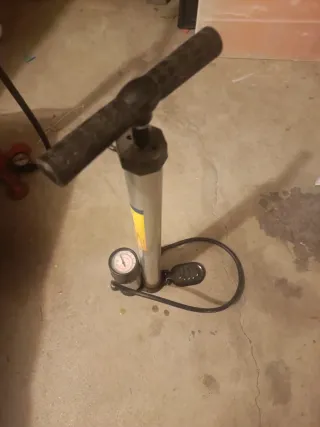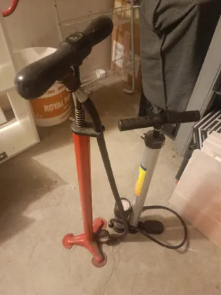 Set di due pompe per bicicletta, ideali per mantenere i pneumatici sempre gonfi. - Una pompa è rossa con base a stella. - L'altra pompa è grigia. Con manometro entrambe