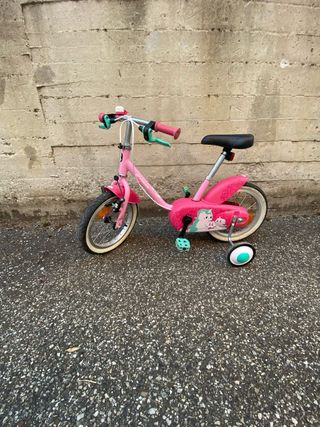 Bicicletta per bambina di colore rosa con decorazioni a tema unicorno. Ideale per i primi giri in bicicletta. - Telaio in metallo resistente. - Ruote stabilizzatrici incluse. - Manopole colorate.