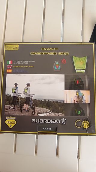 Vendo pettorina Smart Backpack One del marchio Guardian, modello art. 632. È in ottime condizioni. Il sistema di ricarica è molto semplice basta connettere il cavo usb in dotazione a un computer ho a una presa a muro . L'accensione avviene tramite un pratico tasto sul retro della custodia che contiene il pannello dotato di led. Dotato di comando wireless posto sul manubrio staccatabile quando si parcheggia la bici, amplicabili sia destra che a sinistra. - Pettorina catarifrangente verde e grigia. - Include indicatori LED di direzione. - Sistema di fissaggio regolabile.