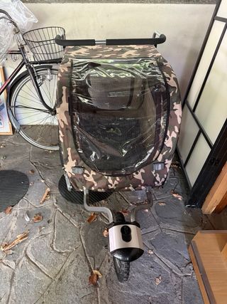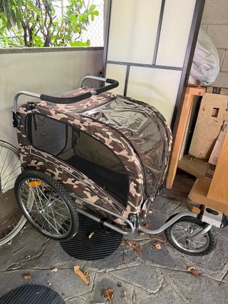 Vendo carrello portabambini/cani per bici, in buone condizioni. Ideale per trasportare i vostri amici a quattro zampe o bambini durante le vostre gite in bicicletta. - Carrello robusto e leggero. - Tessuto mimetico resistente. - Ruote grandi per una guida agevole. - Chiusura di sicurezza.