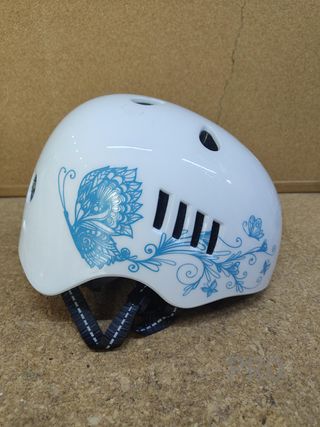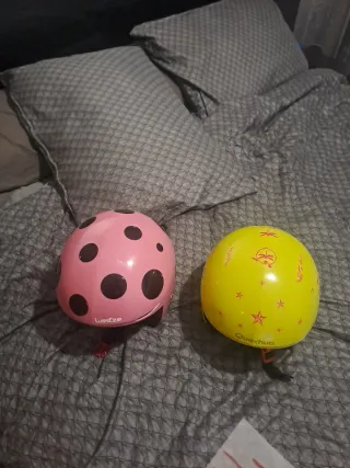 Casco per bambini per bicicletta o pattini. Progettato per proteggere durante le attività sportive. 15 pezzi disponibili - Casco rosa con punti neri. - Casco giallo con stelle e disegni. - Marca: Quechua e Wedze.