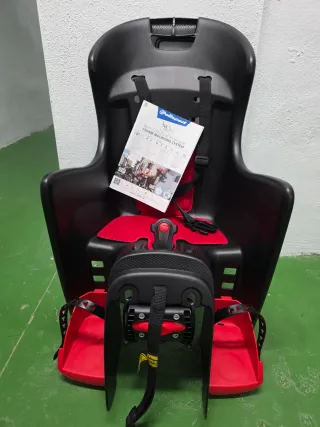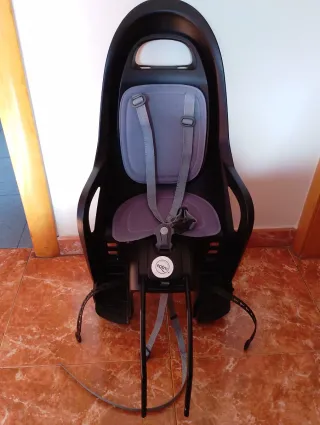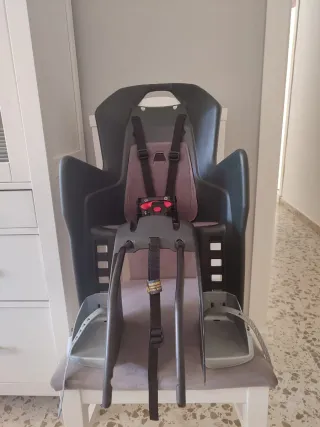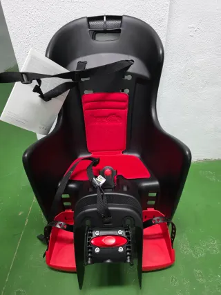 Seggiolino di sicurezza per trasportare bambini in bicicletta. Dotato di imbracature e supporti per i piedi. Colore grigio scuro con dettagli verdi. Sistema di fissaggio con cinture e 5 punti di ancoraggio. Base in plastica resistente. Praticamente nuovo.