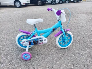Bicicletta infantile a tema Frozen, ideale per i più piccoli. Colore blu e viola. Ruotine incluse. Cestino anteriore. Design con personaggi di Frozen.