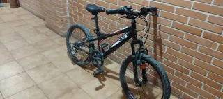 Bicicletta da montagna con doppia sospensione, ideale per terreni irregolari. Il suo design combina il colore nero con dettagli in verde lime. - Ruote da 20 pollici. - Telaio in alluminio. - Freni a disco anteriori. - Cambio Shimano.
