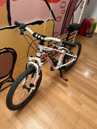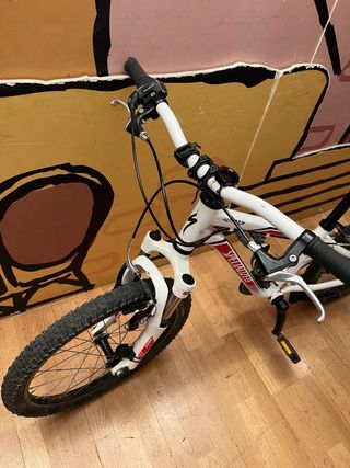 Bicicletta da montagna Specialized in bianco, ideale per iniziare il ciclismo. Con telaio in alluminio, ruote da 16 pollici, freni V-Brake e sospensione anteriore.