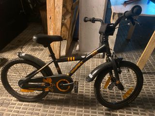 Bicicletta per bambini del marchio Prometheus, con ruote da 18 pollici. Design in nero con dettagli arancioni. Parafanghi anteriore e posteriore. Catena protetta. Presenta segni d'uso, necessita di una buona pulizia poiché è un po' sporca e macchiata di vernice bianca, ma si rimuove facilmente con una pulizia accurata.