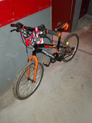 Bicicletta per bambini con ruote da 20 pollici. Telaio di colore arancione e nero. Sella regolabile. Freni anteriori e posteriori. Campanello, catena e pedali. Luce anteriore.