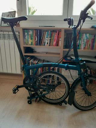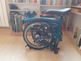 Bicicleta Brompton, modello pre-2015, in buone condizioni. È il modello a 3 velocità, in verde e nero, anche se il sellino ha perso la vernice come si vede nelle foto. Le ruote easywheel sono state aggiornate a un modello telescopico per facilitare il trasporto, così come i pedali, che sono rimovibili. La bici viene usata quotidianamente per andare al lavoro e spesso viene portata in treno e Metro a Madrid. Si vende per finanziare il passaggio a una Brompton elettrica. Possibile consegna a Vigo, Santiago de Compostela o Madrid.