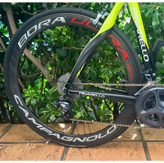 Bicicletta da strada Pinarello in carbonio taglia 52. Un modello progettato per il ciclismo ad alte prestazioni. - Telaio, sella, forcella e manubrio in carbonio, - Ruote Campagnolo - Trasmissione Shimano Ultegra 2x11 - Bielle SRAM Red - Potenziometri Squart