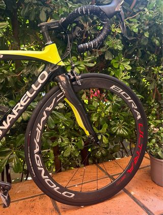 Bicicletta da strada Pinarello con telaio in carbonio. Telaio in carbonio. Design sportivo. Fornita con ruote Mavic, non quelle delle foto. Possibilità di prova. Manubrio aerodinamico. Taglia S.