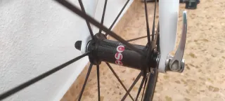 Tubular 28”-700 road bike wheelset with Campagnolo Super Record hubs and Pinarello rims. Hubs work smoothly. Rear has a bent spoke, see last pic for. -Front 28 holes/spokes, weight 920gr (without skewer). Tire to change. -Rear 32holes/spokes, weight 1200gr (without skewer and cassette). Regina Extra 14/22 5s cassette. Vittoria Rally tubular tire in fair condition.