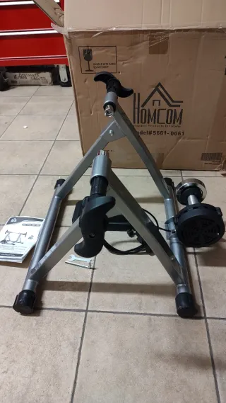 Rulli per allenamento bici HOMCOM, modello #5661-0061. Struttura in metallo resistente. Mai usato! Montato solo per scopo dimostrativo in quanto non presenta nessuna foto sulla confezione. - Telaio pieghevole per un facile trasporto e stoccaggio. - Compatibile con la maggior parte delle bici da strada e mountain bike. Per ruote da 26/27.5/28/29/700C. Si può usare anche con perno passante basta procurarsi un adattatore idoneo. - Include un perno passante e supporto ruota anteriore per una maggiore stabilità.