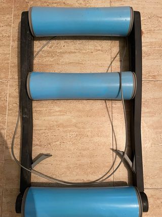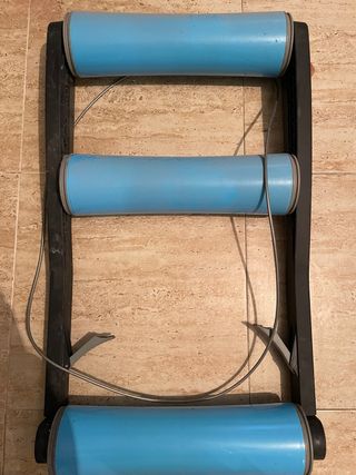 Rodillo per allenamento bici. - Struttura metallica blu (verniciata) ma usurata in alcune parti. - Tre rulli di allenamento. - Bande elastiche rosse.