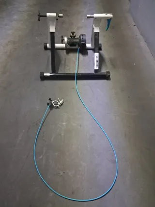 Rullino per l'allenamento di ciclismo su strada. Struttura metallica e tubi neri. Include banda elastica verde.