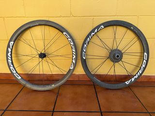 Set di ruote Corima in carbonio per bicicletta. Modello tubolare. Prodotte in Francia. Ruota anteriore al 70% e posteriore nuova senza mai essere stata usata né montata. Pignoni 12 V Ultegra rapporto 11/30, cerchi con profilo 35. Peso completo con chiusure e pignone 2270. Il peso può essere verificato.