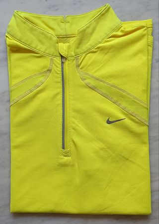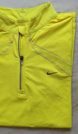 T-shirt per ciclismo firmata Nike. Bello il colore. Chiusura al collo con cerniera. Logo tipico del marchio all' altezza del petto. Tasca con cerniera sul retro. Misure: -Spalle: 39 cm -Lunghezza: 63 cm -Ascella-ascella: 50 cm