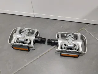 Coppia di pedali per bicicletta color argento. Progettati per offrire una buona presa e durabilità. Quasi nuovi. Sono misti, uno per scarpe con cinturini automatici e l'altro per scarpe senza. - Corpo in metallo resistente. Specialized, Trek, Scott, Canyon, Giant, Orbea, Cannondale, Pinarello, BMC, BH, Merida, Megamo, Lapierre, Mondraker, Santa Cruz, Cube, Focus, Bianchi, Pivot, Ibis, Niner, Felt, Marin, Rocky Mountain, Commencal, Lapierre, Conor, wrc, Orbea, berria, MMR - Include riflettori arancioni. - Asse filettato standard. Ideale per la tua bicicletta.