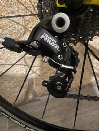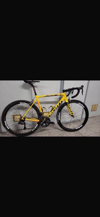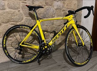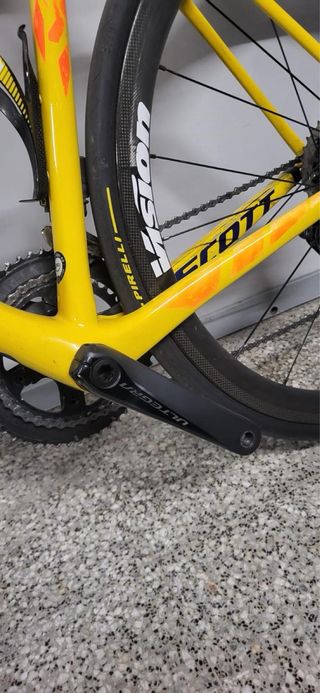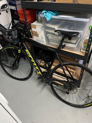 Bicicletta da strada Scott in nero con dettagli gialli. - Telaio in alluminio. - Forcella in carbonio. - Freni a disco. - Ruote 700c. - Ruota posteriore con raggio rotto, necessita cambio ruote. - Presenta alcuni graffi d'uso e mancano 2 copri freni sul lato sinistro. - Cambio Tiagra. - Pedali Look e portaborraccia inclusi. - Sella Massi.