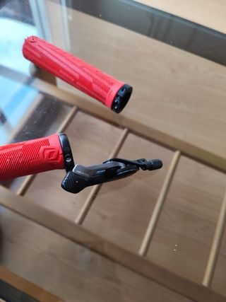 In vendita grip rossi per bicicletta e una leva cambio Scott. - Grip in gomma con texture. - Leva cambio con logo Scott.