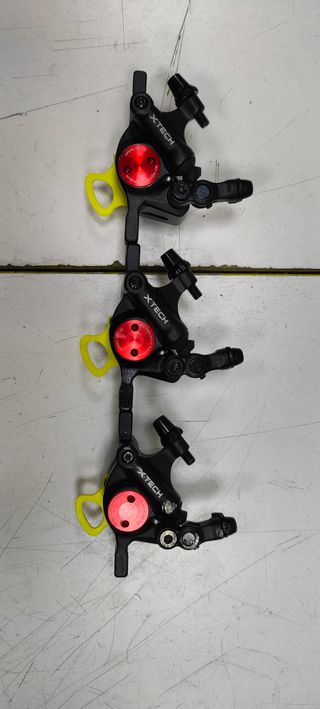 Coppia di pinze freno meccaniche di colore rosso. - Pastiglie con circa l'80% di vita residua.