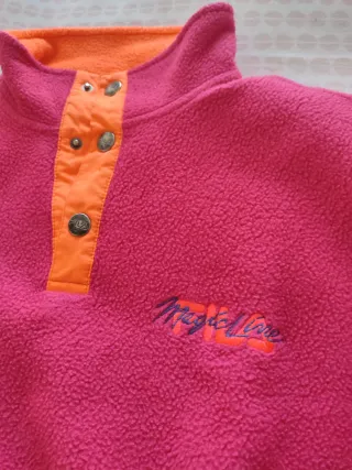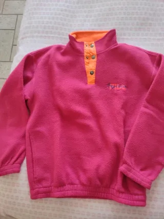 Felpa sportiva in pile,vintage anni 90. Modello Fila Magic Line. - Colore principale fucsia vivace. - Dettagli a contrasto sul collo e sulla chiusura a bottoni. - Tasca frontale. - Polsini e fondo elasticizzati. Taglia 44. In ottime condizioni