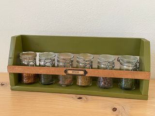 Elegante porta spezie in stile Country Chic, perfetto per aggiungere un tocco rustico alla tua cucina. La finitura verde si abbina splendidamente con dettagli in legno di recupero e metallo. Porta etichetta in metallo anticato Misure 36x14x8cm