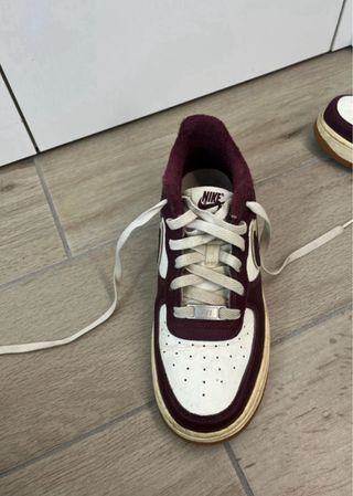 Scarpe Nike Air Force 1 con una combinazione di colori bianco e bordeaux. Design classico e versatile. - Tomaia in pelle con inserti in tessuto. - Suola in gomma per un'ottima aderenza. - Chiusura con lacci.