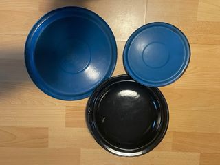 Set di 3 coperchi vintage in metallo smaltato, ottimi anche come decorazioni in stile rustico Diametro 24,5cm quello Azzurro grande, 22,5cm quello Nero e 17,6cm quello azzurro piccolo. Condizioni buone, con qualche segno del tempo che rendono l’oggetto autentico