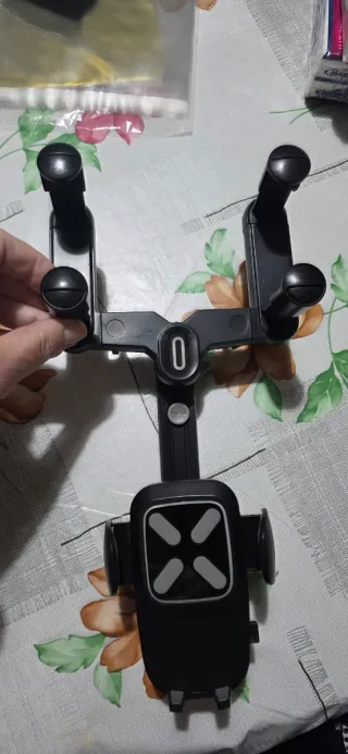 Supporto universale per smartphone da auto. Design nero con finitura opaca. - Bracci regolabili per diverse dimensioni di telefono. - si attacca allo specchietto retrovisore