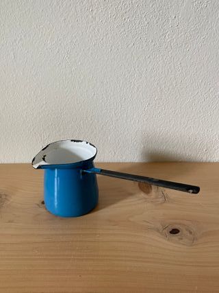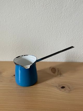 Bellissimo pentolino vintage scalda latte o per preparare il caffè, Realizzato in metallo smaltato di colore blu con manico nero