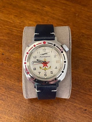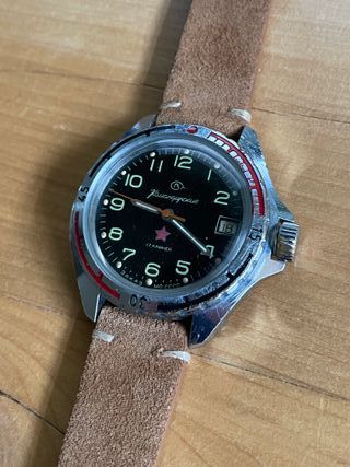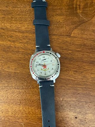 Orologio Vostok Komandirskie funzionante ed in ottime condizioni estetiche, Riserva di carica di oltre 40 Ore. Movimento meccanico a carica manuale Vostok 2414a con 17 rubini e datario. Orologio iconico prodotto in epoca sovietica Quadrante Nero con stella rossa e scritta in cirillico 3aka3 в CCCP (Prodotto per ordine del ministero della difesa dell’unione sovietica). Possibilità di scegliere uno dei 2 cinturini in foto, entrambi nuovi. Cinturino in pelle marrone Cinturino in pelle scamosciata marrone chiaro