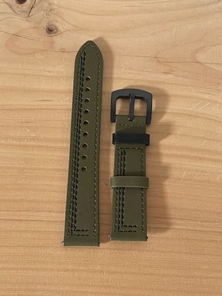 Cinturino in pelle morbida adatto ad orologi con anse da 20mm. Colore verde oliva Il cinturino è dotato di clip per l'installazione e non necessita quindi di anse aggiuntive (sgancio rapido) Cinturino nuovo, mai usato