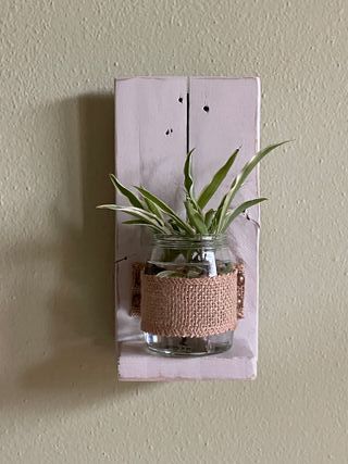 Originale vaso da parete realizzato con una base in legno di recupero e un contenitore in vetro, rifinito con nastro in juta. Dimensioni 20,5x10,5cm