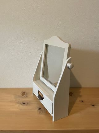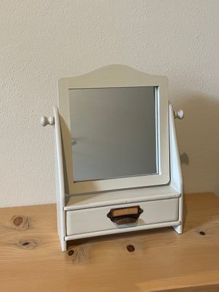 Elegante specchio da scrivania in stile Shabby Chic. Cornice in legno con finitura beige e piccolo cassetto con maniglia in metallo anticato. Dimensioni specchio 17x17cm Dimensioni totali 34x23,5x7cm