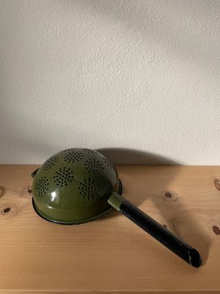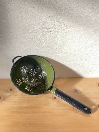 Scolapasta vintage in metallo smaltato colore verde con manico nero. Oggetto autentico anni ’60-’70, Un vero pezzo da collezione, molto decorativo per arredamento in stile country. Diametro 21cm , Lunghezza 43cm Posso fare spedizioni combinate con altri oggetti da me proposti.