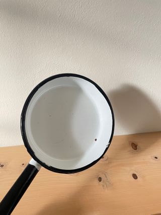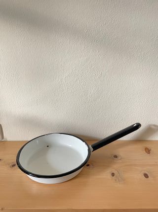 Padella vintage in metallo smaltato colore bianco con manico e bordo nero. Oggetto autentico anni ’60-’70 , molto decorativo per arredamento in stile country. Diametro 24cm Posso fare spedizioni combinate con altri oggetti da me proposti.